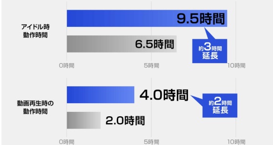 カスタマイズの幅広さも魅力的で、約2万円でアイドリング状態で約27.5時間、動画再生状態で約9.5時間稼働できる、大容量のバッテリーに交換可能です。